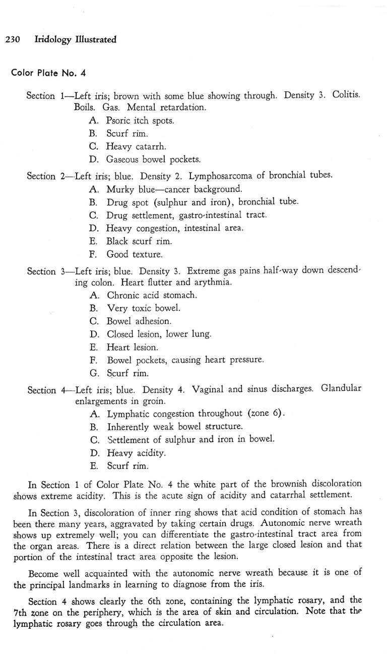 Dr. Bernard Jensen D.C. N.D has studied this extensively. There is an image of an iris (see below) and the "diagnosis" described in detail by Dr. Jensen. The image and the description are from his book: